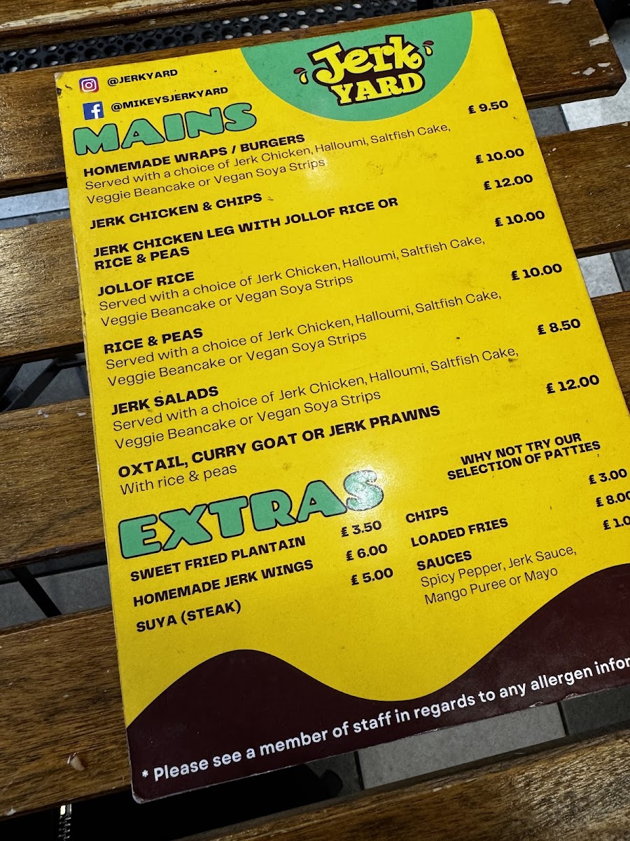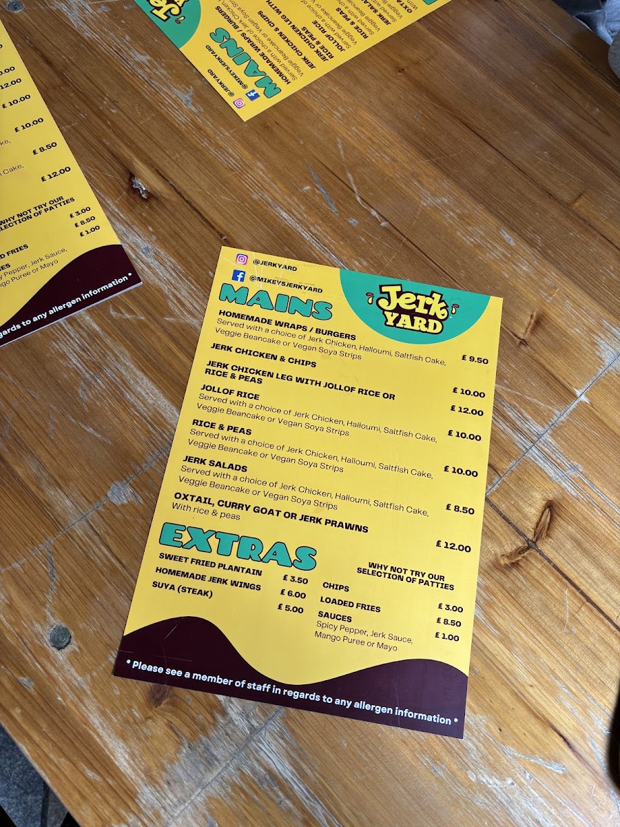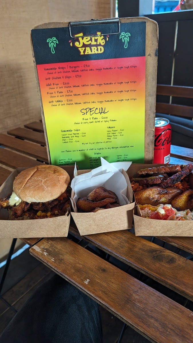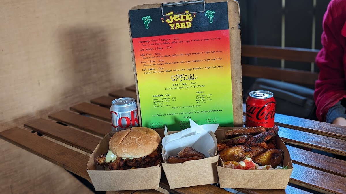 The menu at Jerk Yard offers a vibrant selection of Caribbean-inspired dishes that promise to satisfy a variety of tastes. The mains include options like Jerk Chicken & Chips, which is a classic and flavorful combination, and Jerk Chicken Leg with Jollof Rice or Rice & Peas, which gives a choice between two iconic sides. For a more indulgent option, Homemade Wraps and Burgers featuring jerk chicken offer a satisfying meal for those looking for something portable yet hearty. The sides are equally appealing, with choices like Jollof Rice and Rice & Peas complementing the mains perfectly. Extras like Sweet Fried Plantain, Homemade Jerk Wings, and Suya (Steak) are perfect for adding a little extra flavor to your meal, while the Chips and Loaded Fries provide a satisfying, crunchy accompaniment. The variety of flavors and the deliciously spiced jerk seasoning make this menu a delightful experience for anyone craving authentic Caribbean cuisine.
